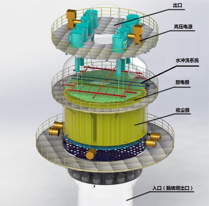 主要由殼體、進(jìn)口煙箱、陰極系統(tǒng)、陽(yáng)極板/管、水沖洗系統(tǒng)(循環(huán)水系統(tǒng))、高壓電源、出口煙箱、氣流分布板、電控系統(tǒng)等組成。